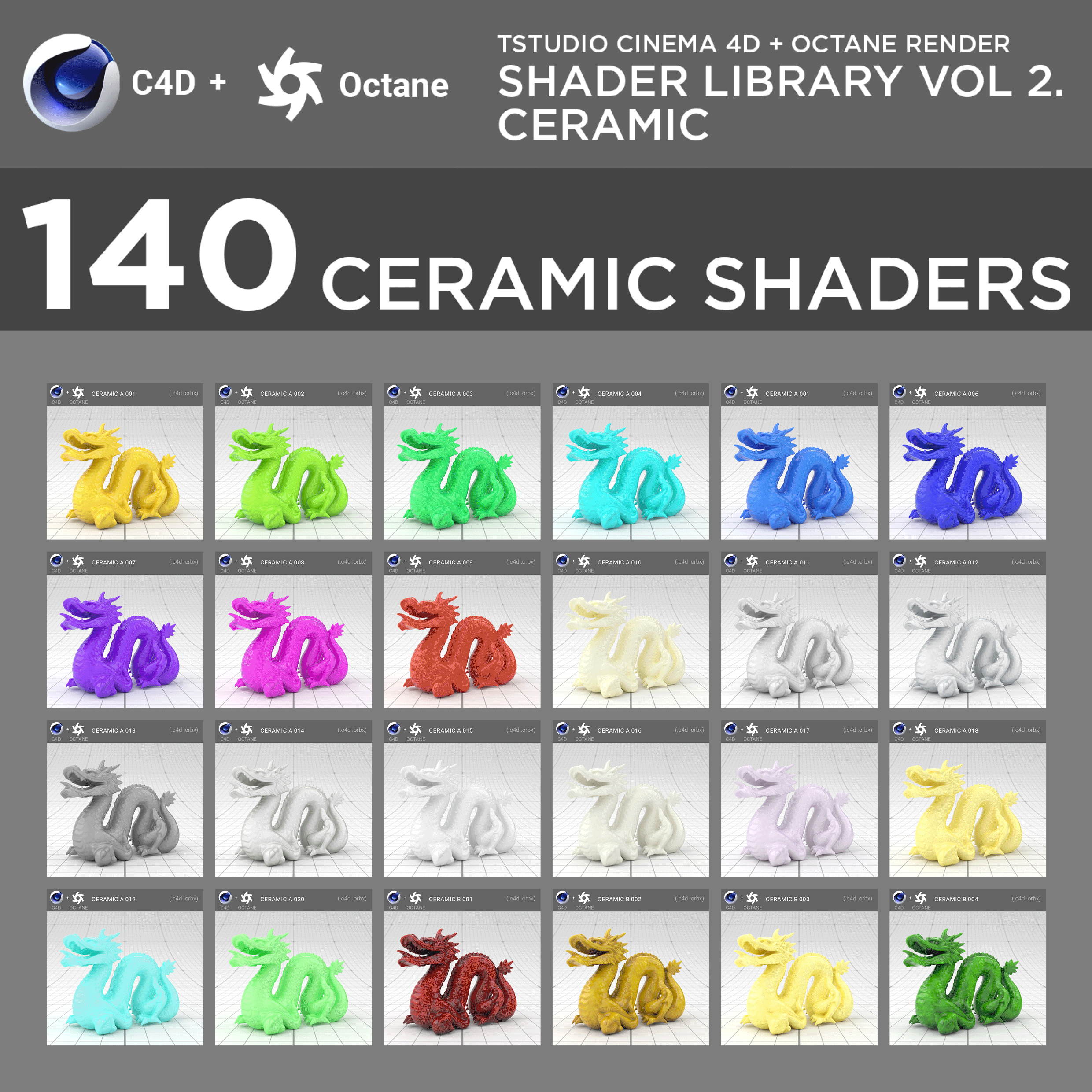 140 high quality advanced shaders for Octane render for CIENEMA 4D (.c4d) and Octane Render standalone (.orbx). The library consist of 140 comon ceramic shaders.